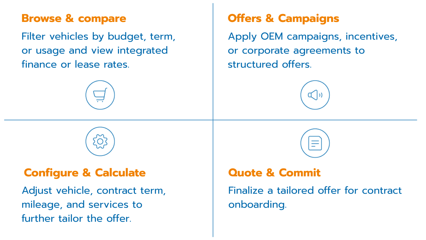 SOFICO Miles Enterprise provides a single pricing setup where pricing rules, values and boundaries are defined and maintained. CPQ journeys across OEM websites, digital platforms, dealerships and fleet tools apply that same logic in context. This guarantees scalable price calculation while keeping alignment from quote to contract, all the way throughout the lifecycle.